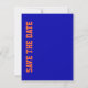 Anuncio divertido de boda de fútbol "Save the Date" hecho en azul real, naranja y blanco. Gráficos de un tacón alto de stiletto azul real pateando un balón de fútbol azul real y naranja decoran la parte superior blanca de la tarjeta. La parte inferior de la tarjeta está hecha en azul real con una franja naranja cerca de la parte superior y texto blanco personalizable listo para personalizar con la información de su boda. La parte posterior azul real tiene texto naranja que corre de lado y dice "Save The Date". Excelentes anuncios de "Save The Date" para la pareja fanática del fútbol.