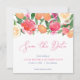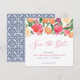 Los kumquats y los cítricos de moda acentuados por contrastes florales rosados brillantes para estas tarjetas de Save The Date que están de moda. El diseño del reverso está tomado de un antiguo diseño de Azulejo (baldosa azul y blanca).