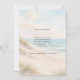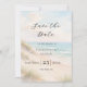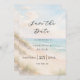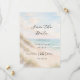 A watercolored sandy beach, sand dunes, ocean waves background. Personalize and add a date and your names. The text: Save the Date is written with a large trendy hand lettered style script.