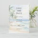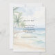 A watercolored sandy beach, ocean waves and palm trees as background. Personalize and add a date and your names.