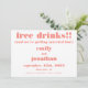 Un humorístico diseño de tipografía audaz para invitar a sus invitados a guardar su fecha de boda. Totalmente personalizable. El texto central está en coral, con el encabezado, Bebidas gratis seguido de un lema, Y también nos estamos casando, sus nombres, fecha de boda y ubicación. En la parte posterior hay un fondo coralino que cambia a un color diferente si se desea con la opción Personalizar Más adelante.
