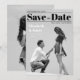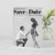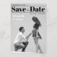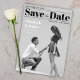 An unusual wedding Save the Date that looks like a black and white magazine cover. It has a black and white photo of a pair of lovers photographed in the moment when the boy proposes to the girl, on his knee; the are seen from profile. In the upper part, the title Save the Date is written in big bold black fonts (except the word "the", that is in script, between two black lines. Above the title and the first line, to the left, there is the date; under the title and the second line, to the right, there is the place; both are also black. To the left of the two lovers, their names are written in white, with the message "Formal invitation to follow" in smaller white fonts under it.