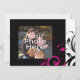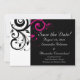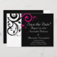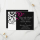 Impresionante e impactante invitación contemporánea contemporánea de bodas negras con acentos blancos y magenta, con delicado fondo de hojas de desplazamiento giratorio. Personalizar en línea con los datos de su boda.