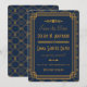 Estas tarjetas de guardar la fecha presentan una paleta de colores azul y dorado, un marco geométrico, patrones geométricos y otros detalles estilísticos inspirados en Art Deco y los felices años veinte. Puedes personalizar los campos de texto de muestra a tu gusto.