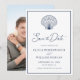 Esta sencilla y mínima boda marinera, azul marino y blanca, salvo la tarjeta de fecha, tiene un cascarón de vieiras en la parte superior, elegante caligrafía de escritura, y un marco alrededor del borde, con una plantilla de fotos en la parte posterior.