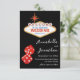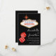 Esta invitación de guardar la fecha personalizada para la boda tiene un tema de casino de Las Vegas en un fondo negro. El clásico letrero de Bienvenido a Las Vegas está impreso en la parte superior con texto de muestra que puedes personalizar. Un par de dados de brillo rojos están impresos en la parte inferior, Los nombres de la pareja y la fecha de la boda de muestra están impresos a la derecha de los dados en una elegante fuente negra.
