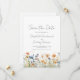 Este diseño boho rústico presenta una frontera de acuarela de flores silvestres naranja y azul a lo largo de la parte inferior. Las palabras "Guardar la Fecha" y los nombres de la pareja aparecen en elegante letra manuscrita gris carbón, con el texto restante en fuente sans serif sobre un fondo blanco.