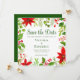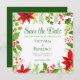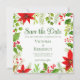 Esta clásica boda de Navidades verdes Save the Date cuenta con flores de puninsettia brillantes en la parte inferior derecha de tu invitación y bayas y vegetación rojas en la parte superior izquierda. Una invitación botánica festiva y brillante para un boda de vacaciones con escritura verde.