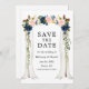 Elegante Boda Canopy Watercolor Boda Floral Azul Rosa Invitación Save The Date Card incluye hermosos rosas de color rosa y rosas azules. El arco de madera boda con dosel incluye vegetación botánica.