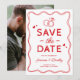 Disfruta del encanto de nuestras tarjetas de anuncio de boda caprichosas y hechas a mano. Cada tarjeta es una obra de arte que presenta divertidas ilustraciones de garabatos rojos, bordes de cinta, corazones de amor y anillos de boda. Diseñadas sobre un fondo blanco fresco y personalizadas con su foto, estas tarjetas son más que un anuncio: son el primer capítulo de la historia de su boda.