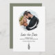 Boda rústica de pinos salva la invitación de fecha, con un sencillo diseño de tipografía. Con letras de personalizable, agrega su propia información. También agrega tu propia foto para añadir personalización. La parte posterior tiene un fondo verde sabio y le da la opción de añadir su sitio web boda y un código QR para que sus invitados puedan escanear. Ideal para planear tu día especial con un estilo boho informal.