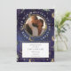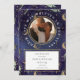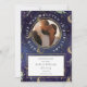Una hermosa tarjeta de boda celestial para guardar la fecha que presenta oro, lunas y estrellas y una foto especial con un fondo azul de medianoche y tipografía moderna y elegante. Diseñada por Thisisnotme©
