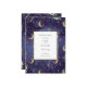 Una hermosa tarjeta de boda celestial con fecha de guardado que presenta oro, lunas y estrellas y monogramas iniciales en el reverso con un fondo azul medianoche y tipografía moderna y elegante. Diseñada por Thisisnotme©