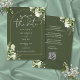 Esta elegante invitación de guardar la fecha de boda con arco floral botánico verde oliva y dorado se puede personalizar con su información en tipografía moderna y elegante con el código QR del sitio web de su boda y detalles en el reverso. Diseñado por Thisisnotme©