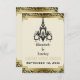 Lámparas de araña Art Decó negras, doradas. Anuncio Save the Date con una lámpara de araña negra, un borde de estilo Art Déco y damasco floral negro y dorado en beige/crudo. Este elegante diseño es un enfoque moderno a un estilo vintage/retro que se asemeja al de los años 20 y el Gran Gatsby. Forma parte de un conjunto de bodas y es completamente personalizable.