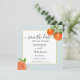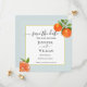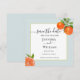 Tarjeta elegante para guardar la fecha de la boda con ilustración de cítricos naranja en acuarela en un borde aqua pálido. Perfecta para bodas de verano.