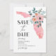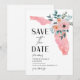 Guardar la fecha de la boda en Florida con una ilustración del estado floral rosa. Diseño simple y elegante con fondo blanco.