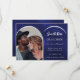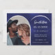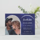 Una foto Guardar la tarjeta de fecha para su boda Al frente: Añadir su propia foto de tamaño vertical. Marco falso de la foto de oro en arco. Un fondo azul marino, texto blanco. El color azul es desigual. Personalice y agregue sus nombres y la fecha.