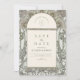 Un lujo salva la tarjeta de fecha con intrincados marcos florales de Art Nouveau de oro suave contra un fondo verde profundo. Esta carta, adornada con delicadas viñas, flores y detalles de época, marca el tono para una celebración boda intemporal y romántica con estilo clásico y sofisticación.