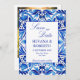 Vintage Talavera Azulejo mosaico mediterráneo azul y blanco plantilla de fotos guardar la fecha invitación de boda plantilla editable descarga digital instantánea, guardar la fecha tarjetas de invitación de boda patrón folk azul y blanco con una imagen al fondo