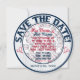 Boda de Béisbol Themed-Round Save the date cards. La parte delantera de la tarjeta es un fotograma/inserción. Anillos interiores y exteriores azules con una foto personalizada en el centro. Eliminar mi foto insertada y reemplazarla con una foto propia. Círculos de texto decorativos de vidrio azul alrededor de la parte superior y dice: GUARDAR LA FECHA. Otro área de texto está en la parte inferior para que puedas personalizarlo. Edite la fecha, escriba sus nombres, etc. Borra/borra el texto si no lo desea. Este texto está a ambos lados de la tarjeta. El fondo de la llanta externa son las rayas azules y blancas de béisbol. En el reverso de la tarjeta, tienes el mismo texto en la parte superior e inferior sobre un fondo rayado. Pequeños adornos de corazón rojo se sientan entre las palabras. El fondo central es de color blanco macizo, con unas bóvedas diseminadas por todas partes. El texto decorativo en vidrio dice: ÉL y ELLA (sus nombres) están subiendo a la placa y bateando 1000 que su amor durará para siempre. Los equipos se fusionarán en uno...Las invitaciones temáticas de los bodas de béisbol están disponibles en varios patrones de mezcla y partidos. Estas invitaciones incluyen también los sobres.