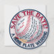 Boda de béisbol Tema-Ronda Guardar las tarjetas de fecha-Plantilla 3. La parte delantera de la tarjeta es un fotograma/inserción. Anillos interiores exteriores y rojos azules con una foto personalizada en el centro. Eliminar mi foto insertada y reemplazarla con una foto propia. Decorativo círculo de texto de vidrio rojo y azul alrededor de la parte superior y dice: GUARDAR LA FECHA. Más texto se sienta en la parte inferior y dice: LA FECHA BODA DE LAS PAREJAS. Edite el texto para fechas, nombres de parejas, etc. Borrar/borrar el texto si no se desea. El fondo de la llanta externa son las rayas de béisbol rojas, blancas y azules. En el reverso de la tarjeta tienes el mismo texto en la parte superior. El texto inferior dice: Un BODA de PLACA HOME. Dos murciélagos de madera, rojos y azules, se sientan a la izquierda. El fondo central es un béisbol blanco con costura roja. El texto decorativo se curva alrededor de la pelota y dice: ÉL y ELLA (sus nombres) están subiendo al plato de casa y bateando 1000 que su amor durará para siempre. Los equipos se fusionarán en uno...su cita. Por favor, únete a nosotros en la celebración mientras juramos nuestro amor por el otro. Las invitaciones temáticas de los bodas de béisbol están disponibles en varios patrones de mezcla y partidos. Estas invitaciones incluyen también los sobres.
