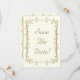 Hermoso y elegante diseño de plantilla de tarjeta de boda de fecha de ahorro de oro antiguo que presenta decorativos rollos de hojas alrededor del borde. El diseño tiene un fondo de color marfil para un aspecto vintage elegante. Este diseño también viene en muchos otros productos de papel y también en franqueo para satisfacer todas las necesidades de su conjunto de boda.