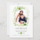Tarjetas de foto para guardar la fecha de la boda en verde y blanco con helechos, flores silvestres y fresas y un fondo de lavado de acuarela verde salvia.