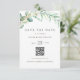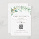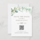 Esta moderna tarjeta de fecha combina la vegetación romántica con un diseño minimalista y un código QR personalizado. Los huéspedes pueden escanear fácilmente el código para acceder a la página web del boda o a los detalles de RSVP. La combinación perfecta de naturaleza y comodidad es ideal para bodas elegantes, ajardinados o al aire libre.