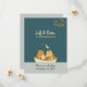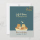 Una encantadora ilustración de un búho cantando y un gato tocando la guitarra en un pequeño barco de vela bajo el cielo iluminado por la luna adorna este caprichoso conjunto de invitaciones de boda con tema de cuento de hadas.