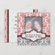 Anuncio de boda de damasco negro blanco rojo personalizado Guardar la fecha. La parte superior es de patrón de damasco rojo y blanco y la parte inferior es de negro y blanco. Una franja roja separa las dos partes. Su texto se escribe en una etiqueta elegante con contorno blanco y rojo.