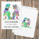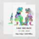 Deleita a tus invitados con esta divertida boda temática de dinosaurios, novios T Rex, para guardar la fecha. Fácil de personalizar con los nombres de los novios y la fecha de la boda. Ilustraciones coloridas de acuarela de novios T Rex con tipografía moderna. Arte original y único de la artista Catherine Sweetman