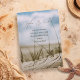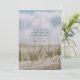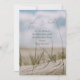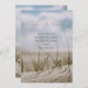 La boda ahorra las tarjetas de cita con el diseño de dunas de mar. Guión moderno para los nombres de pila en la parte superior con toda la información boda impresa a mano en el párrafo siguiente. El texto es de color verde oscuro. La imagen de fondo es arena y hierba marina con cielo azul y nubes. Este diseño de temática playera está pensado para cualquier evento boda costero.