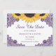 La elegante boda de girasol rústico morado salva las tarjetas de dátiles con flores de girasol y encaje floral morado. Los artículos de juego disponibles para complementar esta boda de moda rústica morada ahorran las tarjetas de cita.