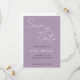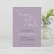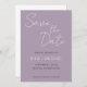 Invitaciones sencillas de boda para guardar la fecha con escritura estilizada en blanco sobre un fondo de color malva de moda. Edite y reemplace nombres, fecha y ubicación con los suyos. Seleccione el tamaño de su invitación y el estilo de papel.