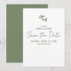 Tarjeta plana de guardar la fecha moderna y minimalista. La parte delantera es limpia y minimalista con texto personalizable y una sola rama de eucalipto en acuarela. La parte trasera es de un verde salvia sólido.
