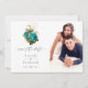 Tarjetas de aviso de boda con rosas acuarelas turquesa y dorado en estilo shabby chic con tipografía de escritura a mano elegante y reverso de damasco.
