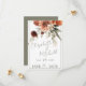 Esta moderna pero rústica tarjeta de aviso de boda presenta un ramo superior de flores de color rosa melocotón, óxido, terracota, marrón y blanco. El fondo es blanco con un marco delgado de verde salvia; la parte posterior es de un verde salvia suave. Este diseño es parte de la suite de tarjetas de Boda de Flores de Terracota Rústica creada por Simply Farmhouse Press.