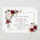 Tarjeta elegante con diseño de flores de borgoña y hojas verdes en acuarela, un marco dorado falso, divisor floral, sobre fondo blanco. En el reverso, los mismos ramos de flores. Utilice la herramienta Personalizar para agregar su información, cambiar las fuentes y los colores de las fuentes. Para artículos coincidentes, visite mi Colección de Flores de Borgoña.
