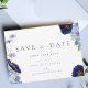 Hermosas flores silvestres de verano pintadas a mano pintadas a mano en azul marino, flor de maíz azul, púrpura, verde y amarillo casamiento ahorran la tarjeta de cita. Flores que incluyen cosmos, flores de maíz, amapolas y me olvidan de no tener follaje. Plantilla fácil de usar con un guión moderno elegante de tipografía. Perfecto para una boda de verano o primavera con temática floral de color azul marino. Obra original de la artista Catherine Sweetman. En la moderna suite boda azul flor silvestre hay artículos de boda a juego.