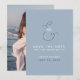 Invitación de guardar la fecha de boda azul polvoriento moderna, elegante, minimalista, contemporánea y trendy con foto trasera y monograma con iniciales y ampersand de moda.