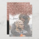 La elegante, glamorosa y moderna tarjeta de guardar fecha de boda con foto es perfecta para la pareja comprometida contemporánea y elegante. Cuenta con un bloque de color con brillo de confeti rosa dorado impreso falso y salpicado sobre un simple fondo negro. La parte posterior muestra el mismo brillo pero en un panel más grueso. Este diseño chic, lujoso y único será un éxito con todos sus invitados. **¡Agregue su propia foto!