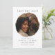 Para la pareja que se va a casar y quiere una boda simple, pero contemporánea y elegante, salve la fecha. Esto permite guardar la tarjeta de fecha para la inclusión de una foto de pareja, los nombres de la futura novia y novio y la fecha de boda importante. Hágale saber a amigos y familiares que ahorren la fecha en su calendario con una simple, elegante y minimalista boda, ahorrando la fecha. La foto de la pareja aparecerá en un círculo irregular y de moda, lo que le dará al diseño un toque más contemporáneo.