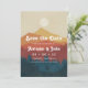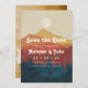 Una boda a la moda salva la invitación de citas para su próximo boda de montaña o bosque. Este diseño presenta un ilustracion sutilmente afligido de un paisaje montañoso y forestal de color amarillo, naranja y azul marino, con detalles de su boda en blanco retro. agregue su foto favorita al revés.