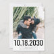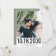Boda Guardar la tarjeta vertical Date 5x7 con un diseño de tipografía simple y moderno con una gran sobreposición de fecha de letra delgada sobre la parte superior de la foto que subes a la plantilla y escribe los nombres y la ubicación del boda y la fecha para un diseño rápido y sencillo que funcionará con cualquier tema que elijas más tarde. Los colores de fondo y las fuentes son editables para que coincidan con el esquema de color, y puede agregar más información o fotos adicionales en la parte posterior.