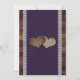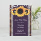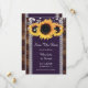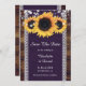Boda rústica violeta y girasol salvan las tarjetas de cita con girasoles y luces de cuerdas contra un fondo de madera de granero con arpillera y encaje. Dos corazones en la espalda.