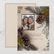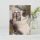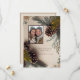 Agrega tu foto favorita. Hermosa tarjeta de boda de invierno con bonitas piñas, ramas de pino y acentos dorados en un fondo de gradiente cremoso.