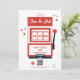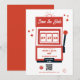 Un diseño único de boda con temática de Las Vegas Casino. Un moderno destino de Las Vegas, Nevada boda con cartas de juego, casino y ilustraciones temáticos. Una boda roja y blanca en Las Vegas ahorra el diseño de la tarjeta de cita ideal para los bodas temáticos del casino. También hay disponibles invitaciones de boda coincidentes y otros artículos de papelería.