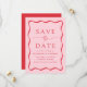 Anuncie su próximo boda con estilo con nuestra boda Modern Wavy Frame, ¡salve las fechas! El diseño presenta sus nombres y detalles bodas enmarcados por un marco ondulado rojo que contrasta con un fondo rosado. Esta exquisita mezcla de diseño moderno y retro garantiza que tu fecha no es meramente un recordatorio de tu próxima celebración, sino un querido aguijón que captura la esencia de tu historia de amor.