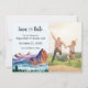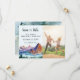 Boda de montaña Salva la fecha con tu foto. La tarjeta está diseñada con una escena de montaña acuática con agua y pinos en la parte inferior de Save the Date. Puede editar todos los detalles del texto y agregar su propia foto. En la parte trasera de la tarjeta hay un cercado del bosque de pinos. Si tiene problemas con la ubicación de la foto o el texto, puede hacer clic en el botón Personalizar para abrir el editor de diseño.